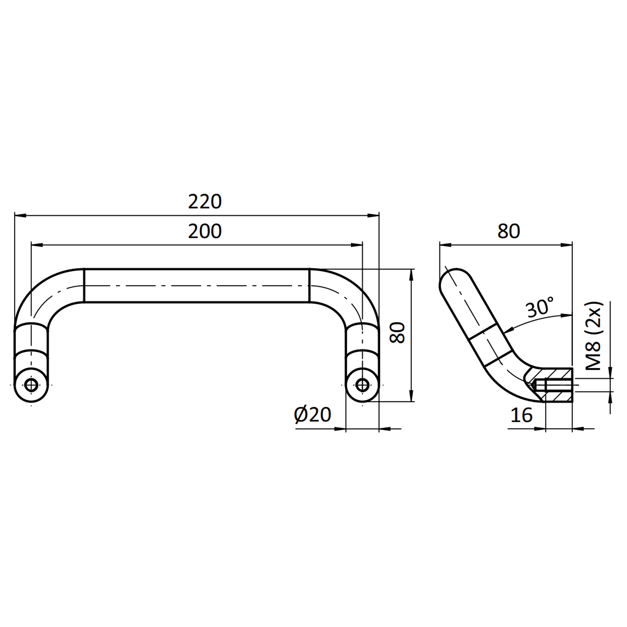Griff, Handgriff gebogen, 200, Aluminium, pulverbeschichtet, schwarz