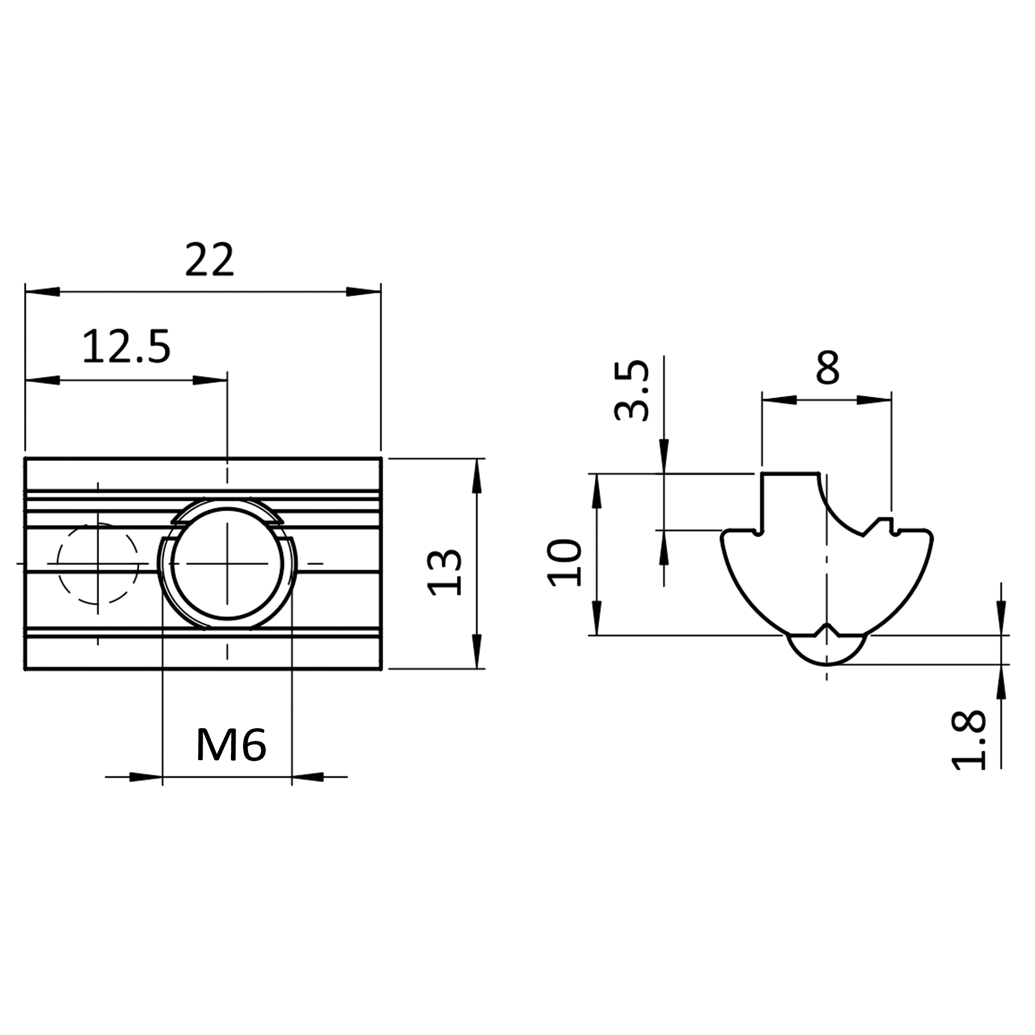 Nutenstein M6, Nut 8, mit Steg, Aluminium