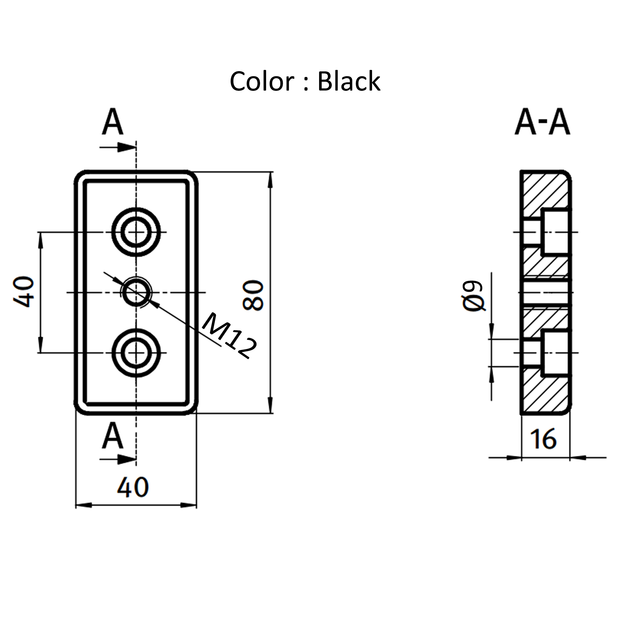 Platte, Transport- und Fußplatte M12, 40x80x16, Zink-Druckguß, pulverbeschichtet, schwarz
