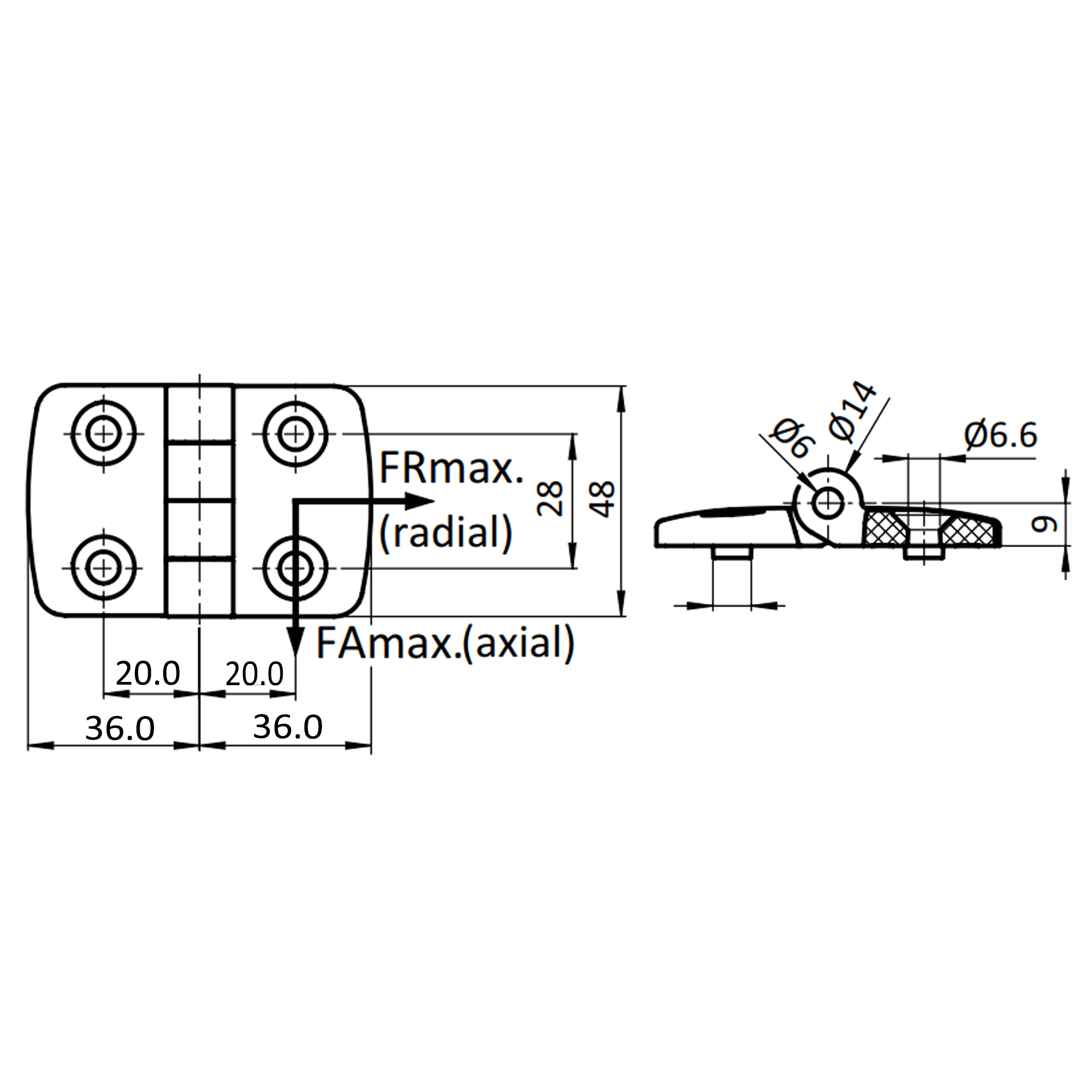 Scharnier, Kunststoff-Kombischarnier, 72x48x16, Kunststoff PA glasfaserverstärkt, schwarz
