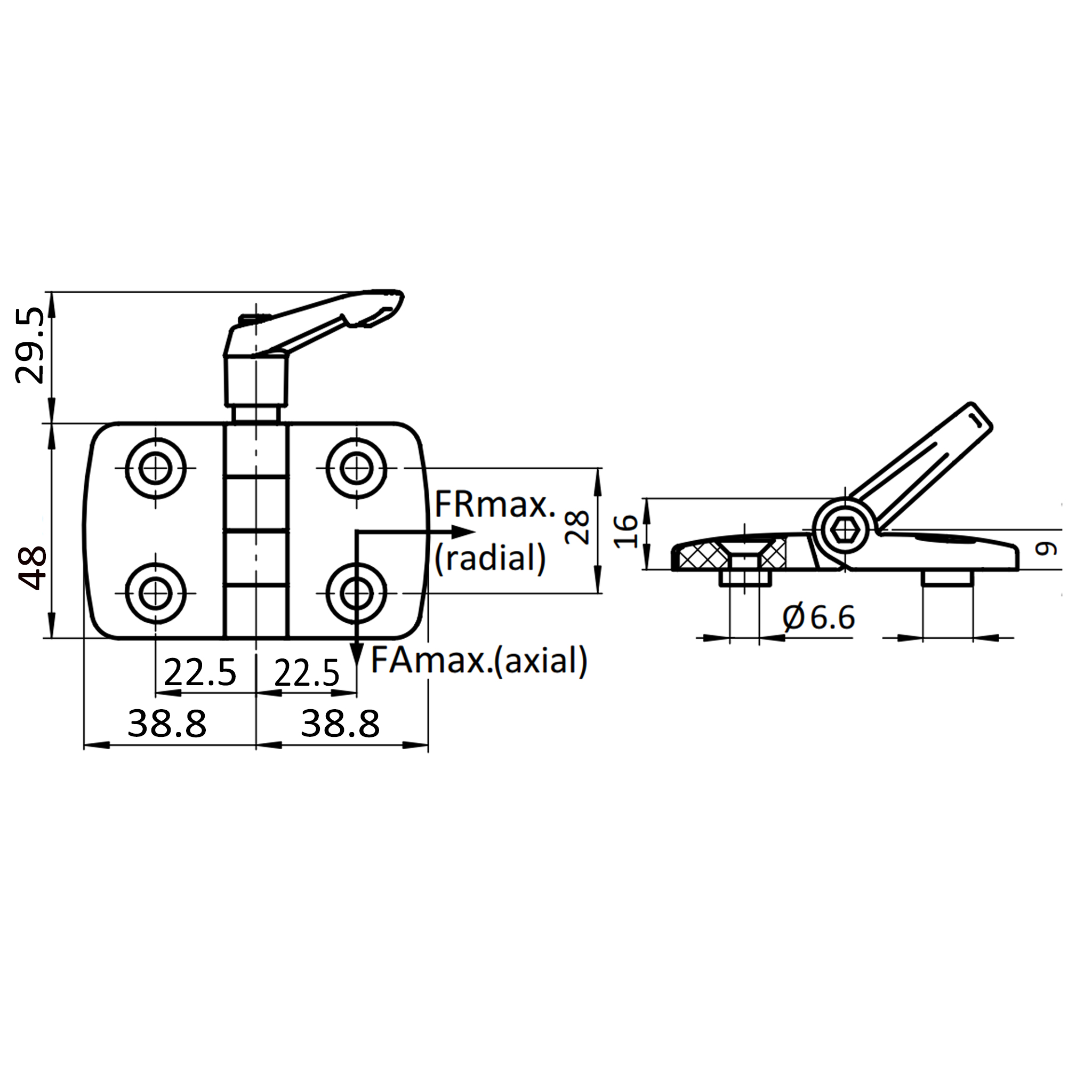 Scharnier, Kunststoff-Kombischarnier, 77x77,5x16, Kunststoff PA glasfaserverstärkt, schwarz
