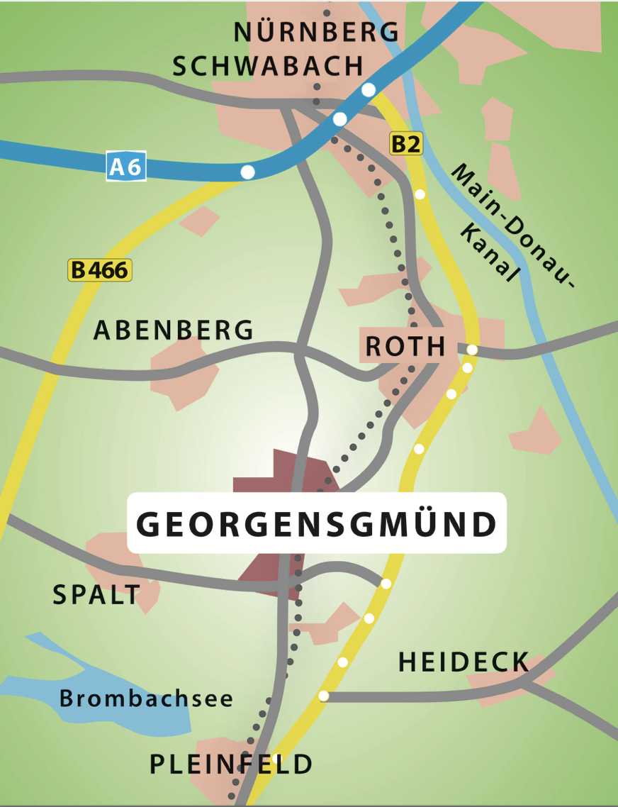 - Über die A6 Heilbronn–Amberg, Ausfahrt Roth auf die Bundesstraße 2(B2) Richtung Augsburg/Weißenburg auffahren, die Ausfahrt „Georgensgmünd“ nehmen und der Beschilderung folgen.