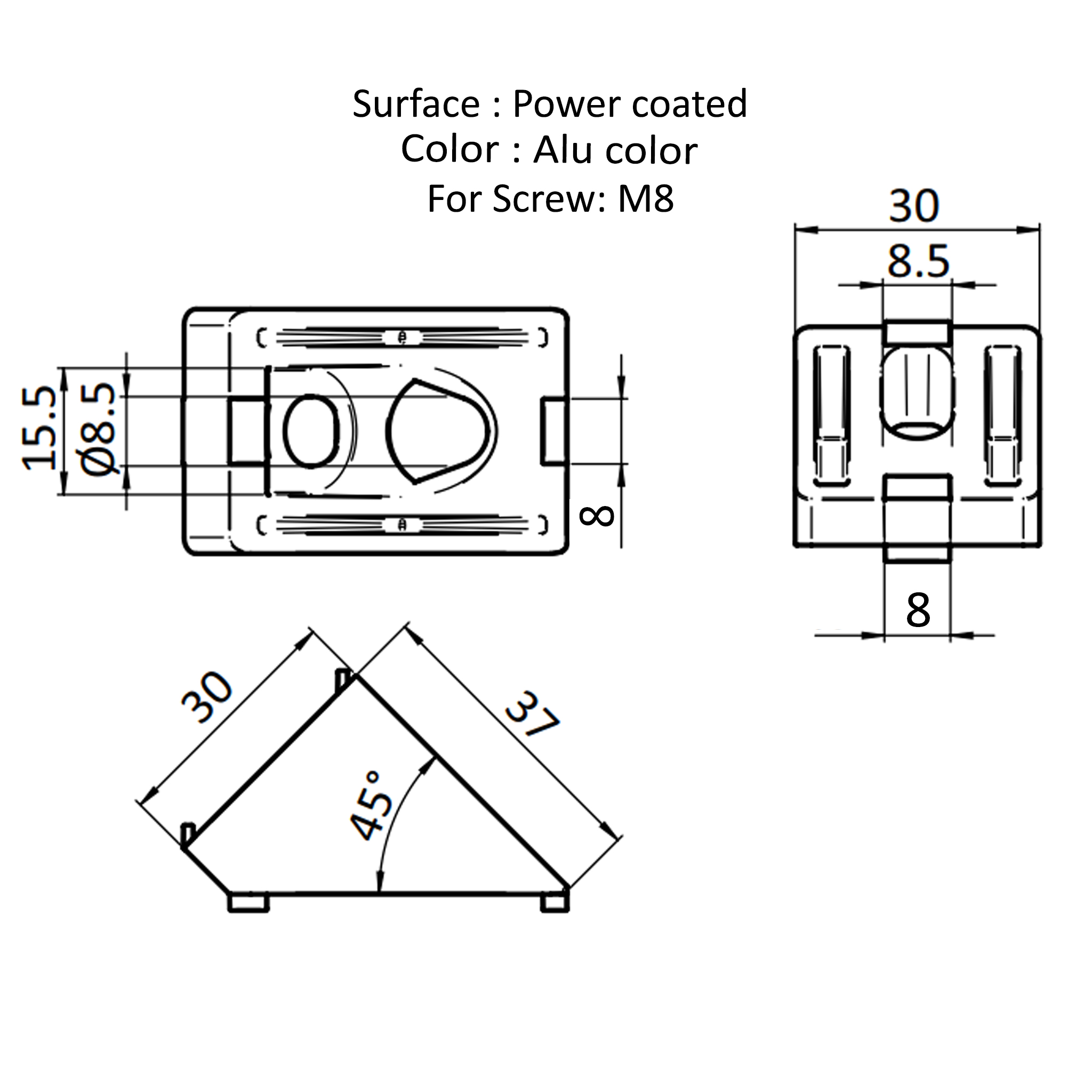 The connector, 45-degree angle connector, 30x30x30, made of die-cast aluminum, powder-coated and aluminum-colored, presents itself as a masterpiece of engineering from 3d24. This product combines timeless design with innovative technology and offers you a durable and excellent solution for your connection needs. The angle connector is specifically designed for constructions where stability and precision are paramount.Product Features