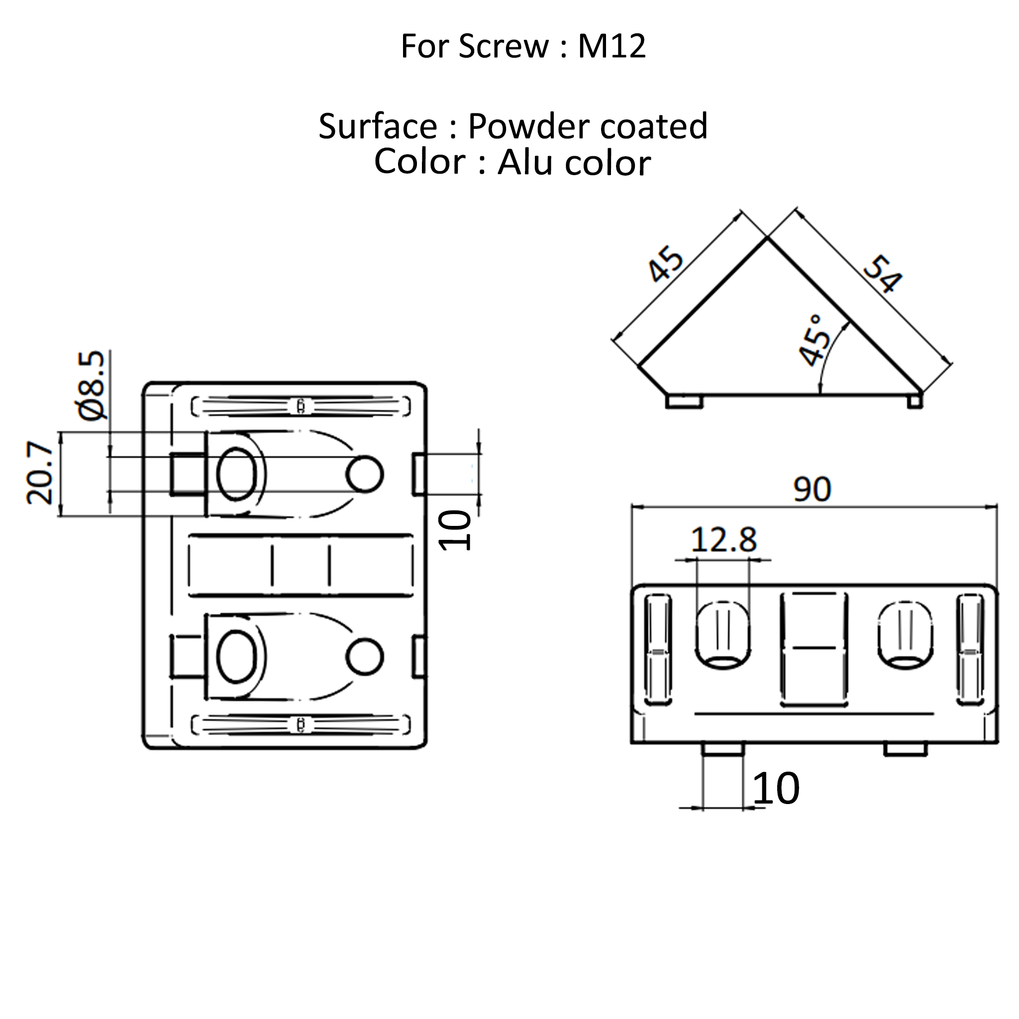 Overall, the connector, 45° angle connector, 90x45x45, aluminum die-cast, powder-coated, aluminum-colored from 3d24 offers an outstanding combination of quality, functionality, and design. Its comfortable handling, coupled with top-notch craftsmanship and excellent material properties, makes it an optimal choice for anyone looking for a reliable and durable connecting piece. Trust in the expertise of 3d24 and invest in a product that will not disappoint you.| Additional Property: | for screw M12 |