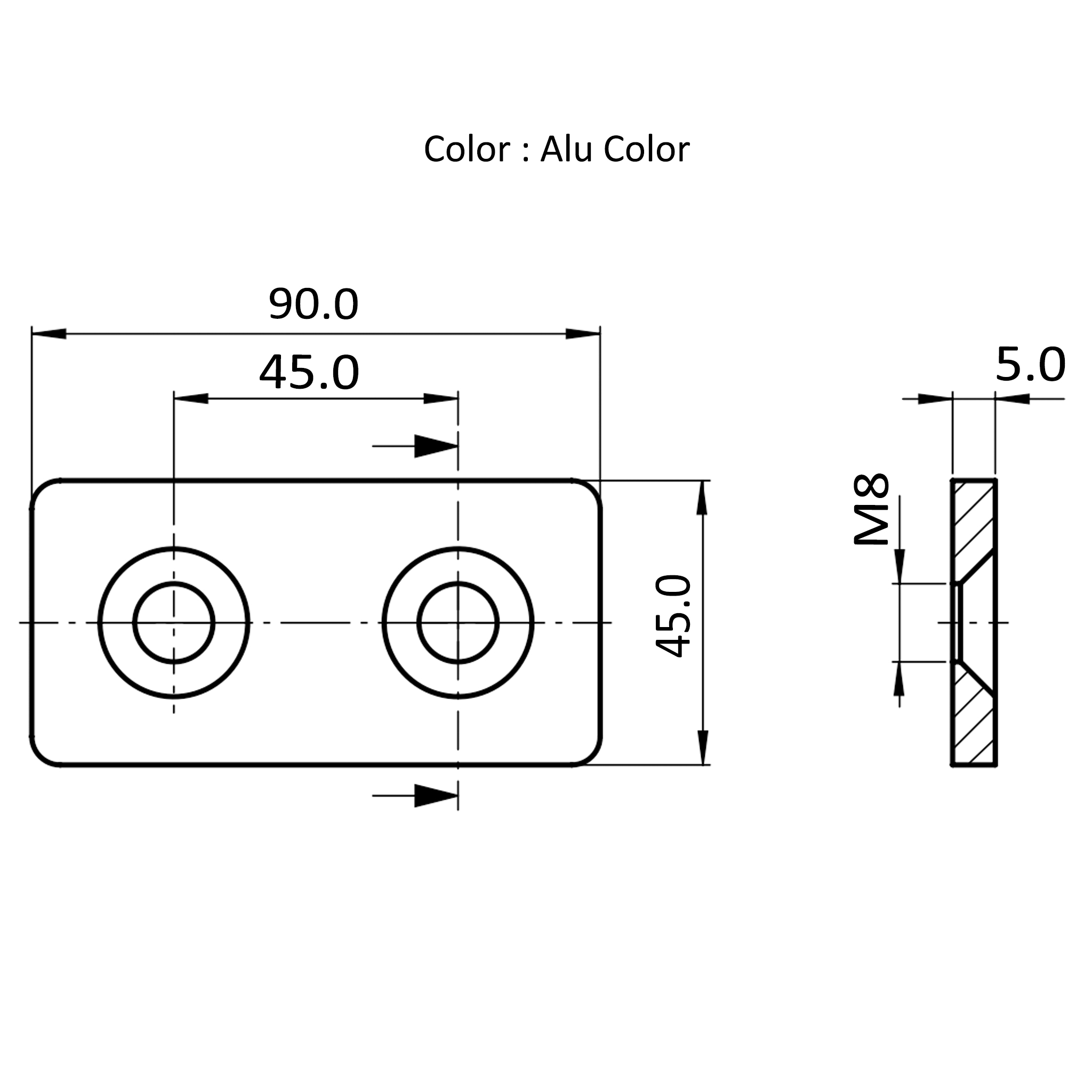 The Plate, Connector Plate, 90x45x5, Steel, Powder-Coated, Aluminum-Colored by 3d24