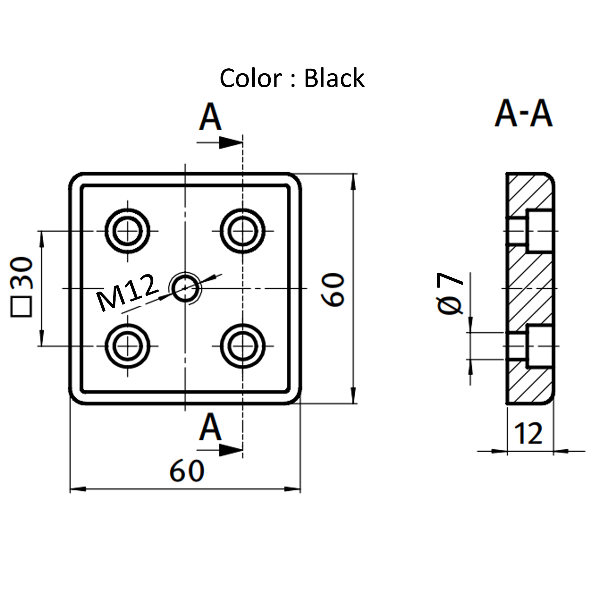 Plate, Transport and Base Plate M12, 60x60x12, Zinc Die-Cast, Powder-Coated, Black