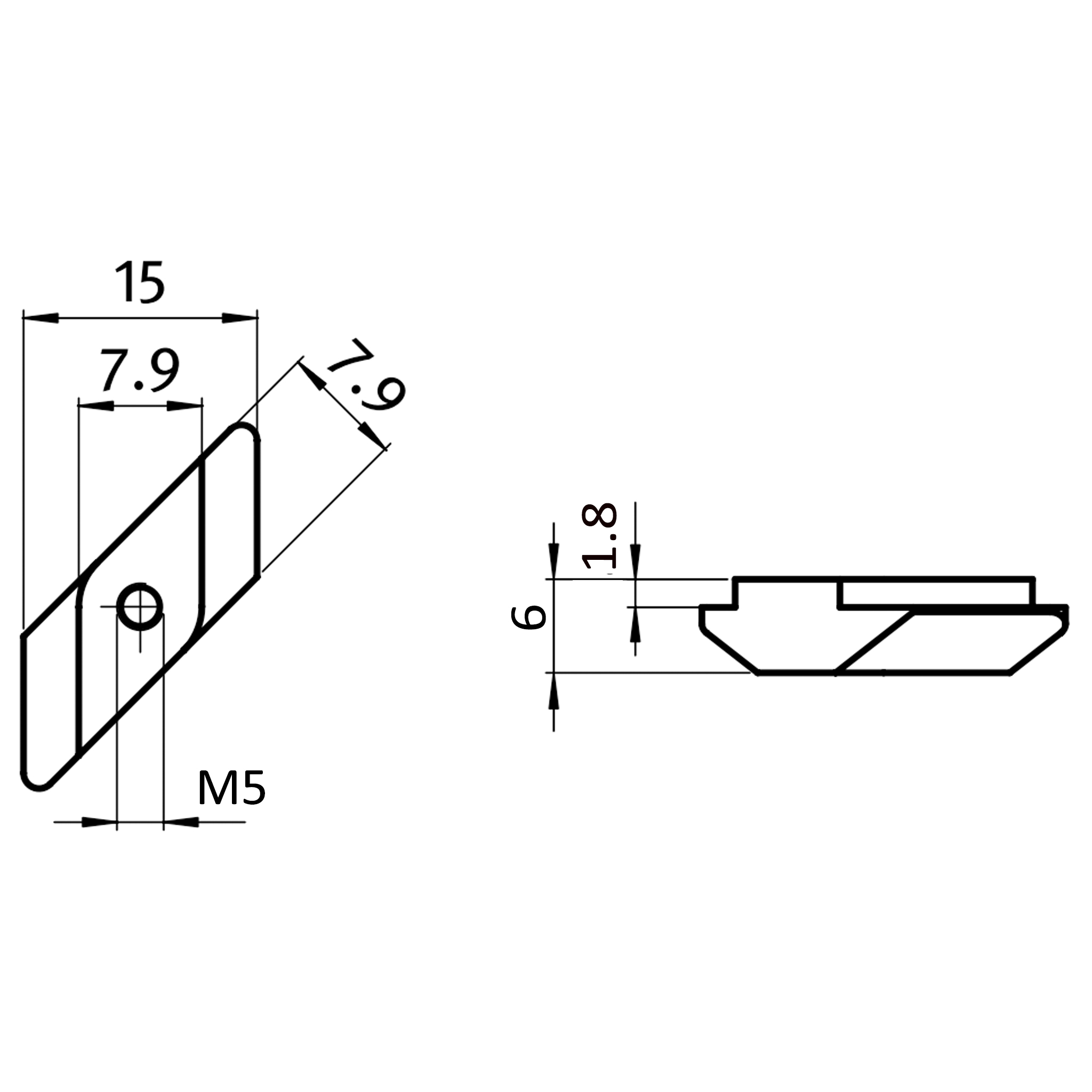 The Rhombus Nut M5 is designed with a slot 8, making it ideal for use in profile systems. The Type B with bridge ensures stable anchoring and guarantees a secure connection. Made from zinc die-cast, this nut offers exceptional strength and corrosion resistance. The plain finish not only gives the product an elegant appearance but also ensures smooth integration into existing systems. This rhombus nut is characterized by its precise manufacturing and exact fit.Advantages