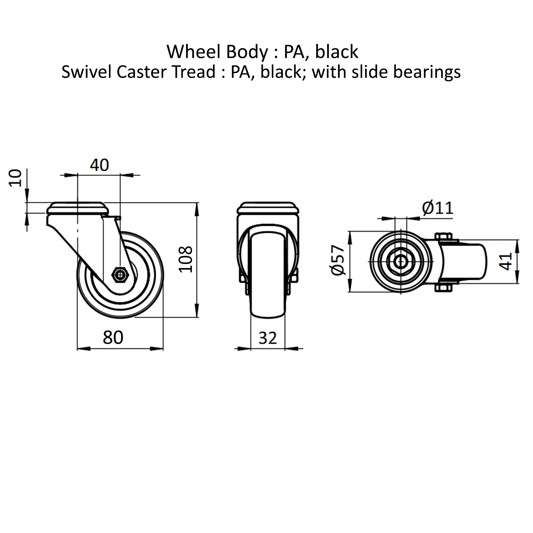 Roller, Swivel Caster, D80, Wheel Body PA, black